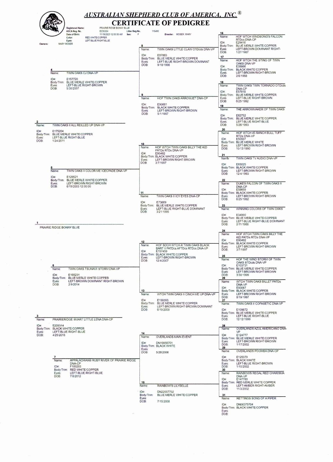 Prairie Ridge Bonny Blue ASCA & AKC 2023 Red Tri Female 30 LBS Sire: Twiin Oaks II All Reilled Up Dam: Prairie Ridge Smart Little Lena DNA: AKC & ASCA ~