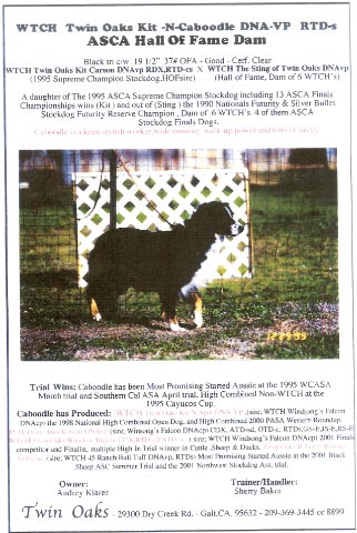 HOF WTCH Twin Oaks Kit Carson DNA vp, RTDcs, RDX, Sherry is Twin Oaks Kit Carson, ASCA Supreme Champion stockdog, meaning a dog which won the National Stockdog Finals in all three categories of stock (cattle, sheep, and ducks) in the same year. Kit Carson accumulated more finals championships in his career than any other dog in ASCA history. Cashel has Kit Carson twice in his pedigree! |
