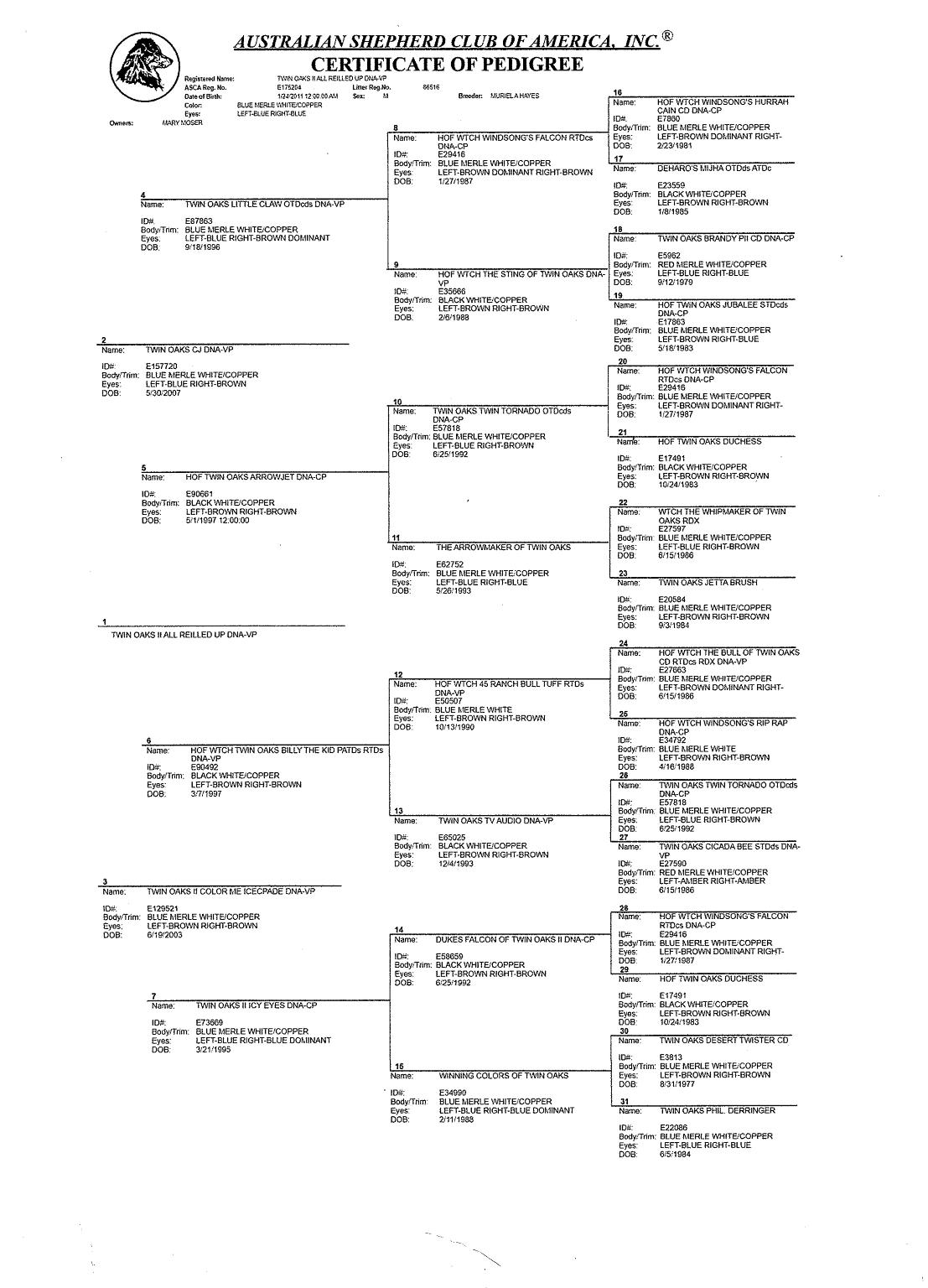 Twin Oaks II All Reilled Up ASCA & AKC 2011-2024 Blue Merle Male 60 LBS Sire: Twin Oaks CJ Dam: Twin Oaks II Color Me Icecpade DNA: AKC & ASCA ~ VP OFA Hips: GOOD DM: NORMAL CEA: Normal/Normal MDRI: Normal/Normal HSF4: Clear/Normal PRA: Normal/Normal CERF: Normal/Normal